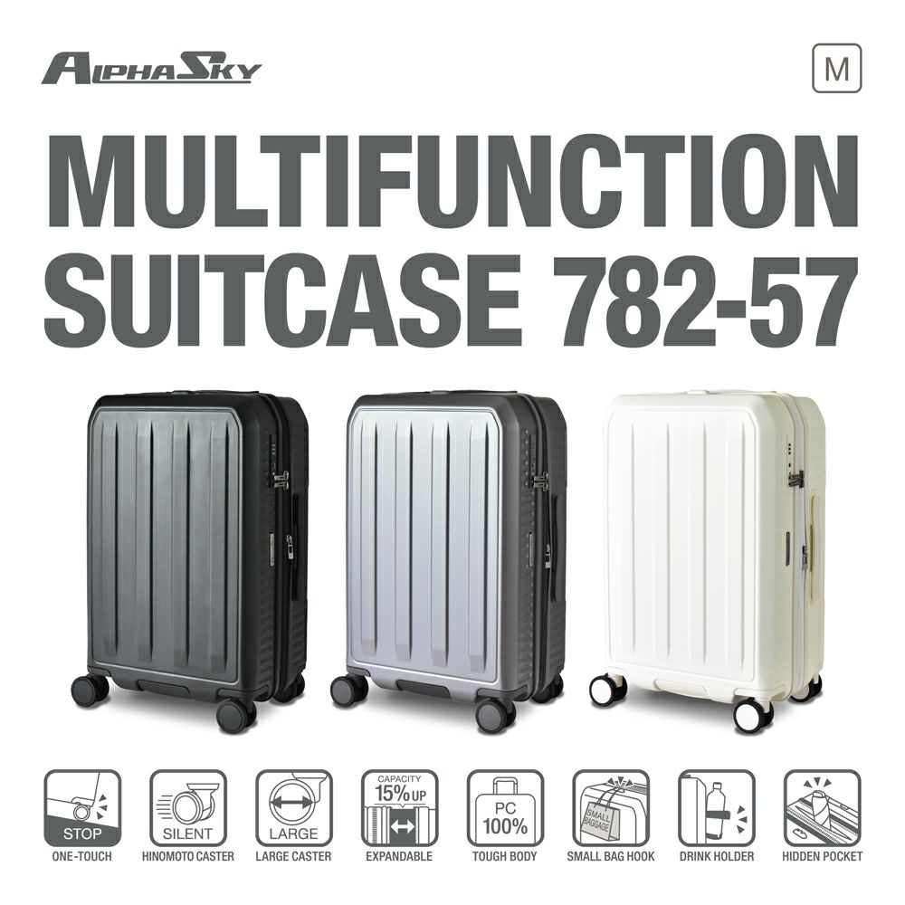【会員限定20%OFFクーポン配布中】【新商品】スーツケース ストッパー付き 拡張 ドリンクホルダー Mサイズ 大容量 51L(59L) 軽量 HINOMOTO 静音 ダブルキャスター ビジネス 国内旅行 出張 高性能 多機能 キャリーケース キャリーバッグ アルファスカイ 3泊 4泊 782-57