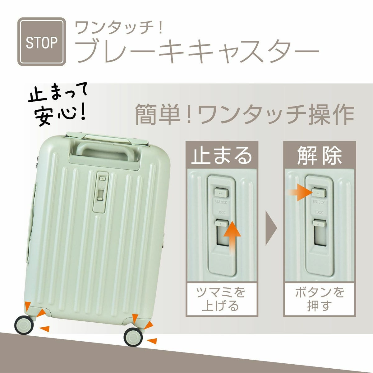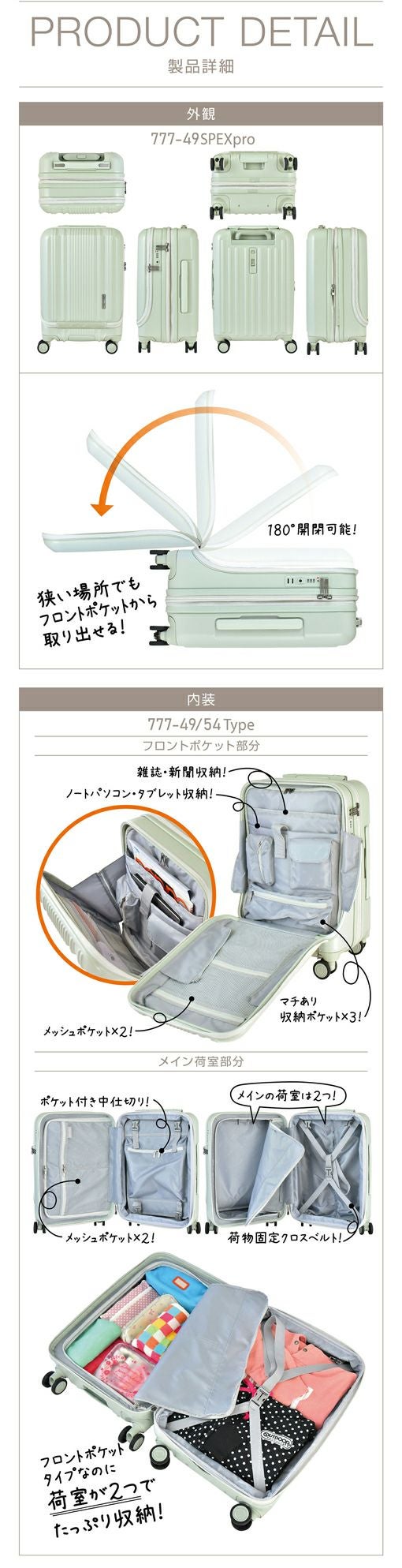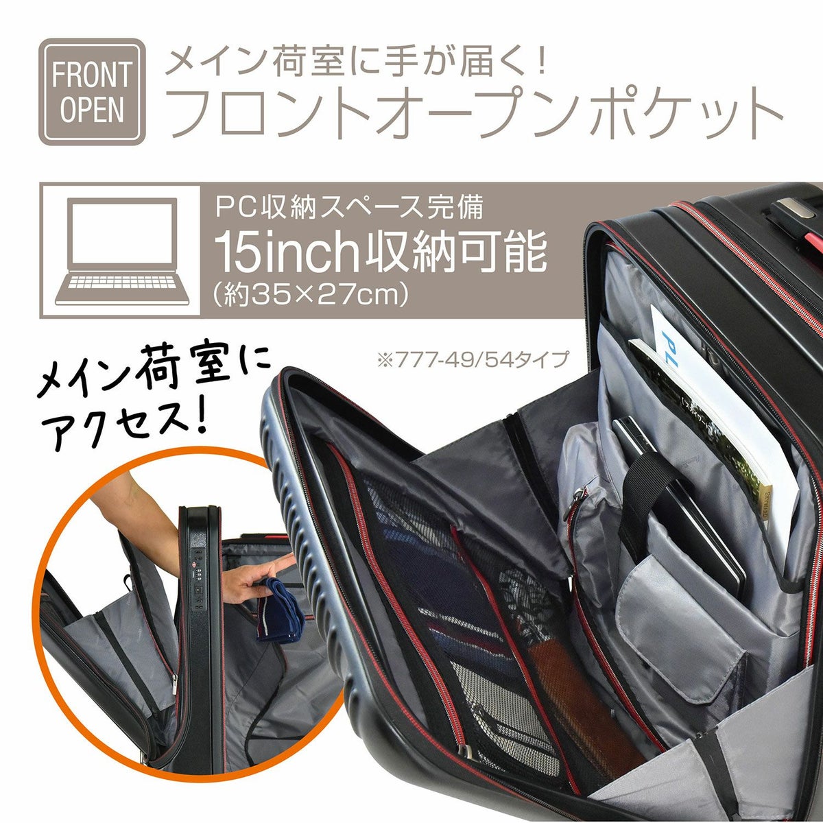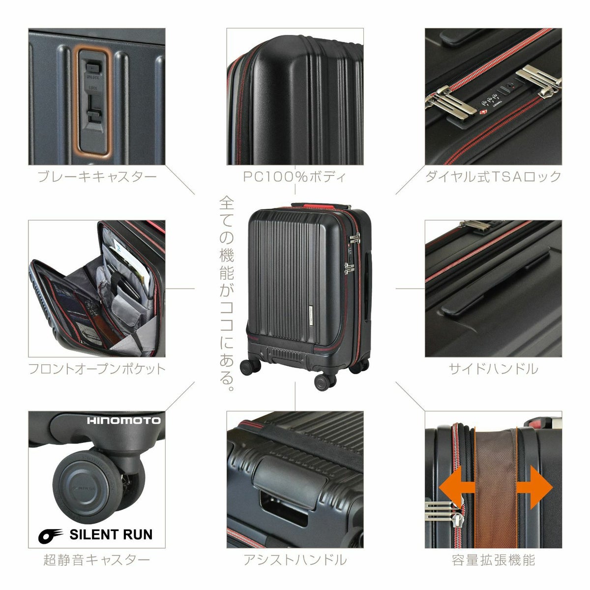 ストッパー HINOMOTO製 超静音キャスター フロントオープン ポケット 貫通型 容量拡張 大容量 軽量 拡張 ビジネス
