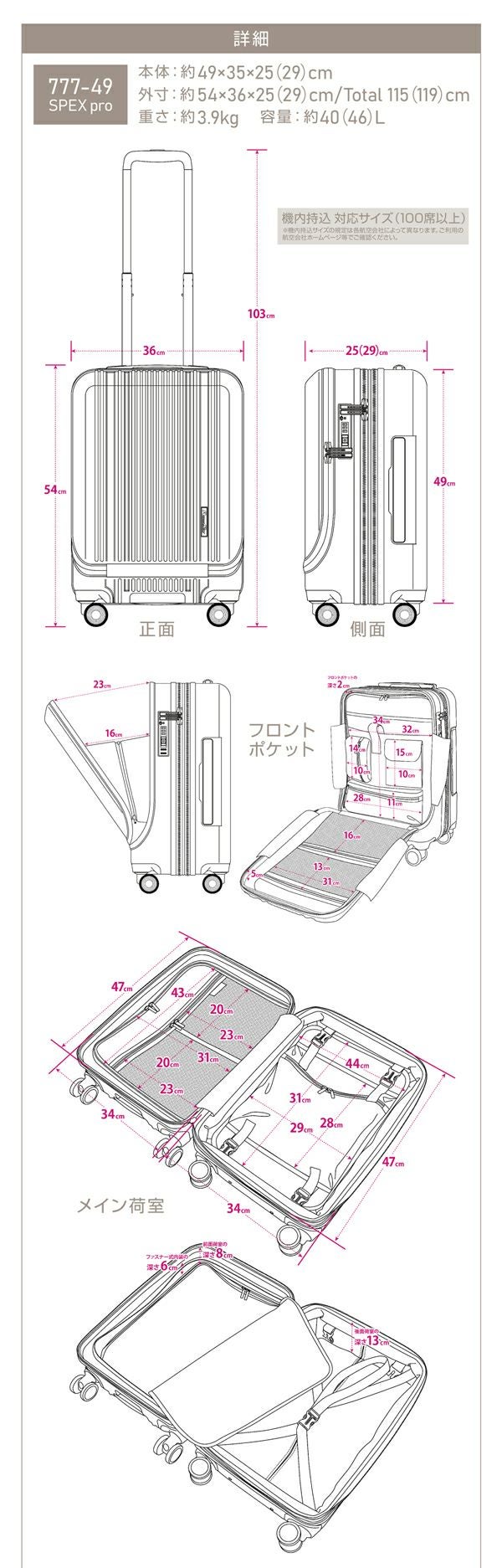ALPHA SKY(アルファ スカイ)777SPEXpro Sサイズ【40リッター】機内持ち込み可能 フロントオープン |スーツケース キャリーケース 軽量 ビジネス 軽い 大容量 修学旅行 出張 ハード キャリーバッグ おしゃれ キャリー ケース 旅行 バック