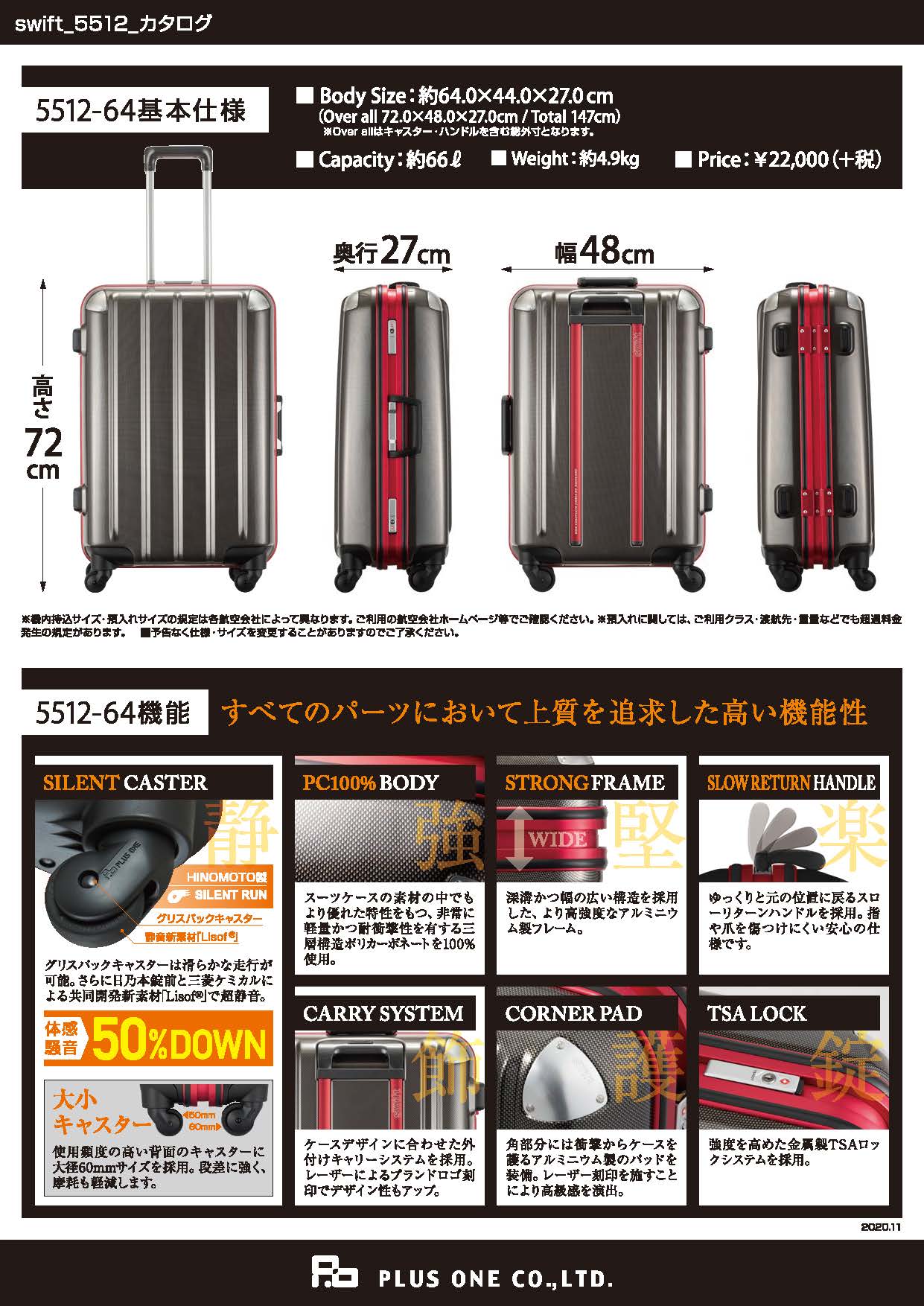 • プラスワン自社企画開発商品プラスワン製品は「品質」「デザイン」「アフターケア」の3つに重点をおき、日本に拠点を置くラゲッジメーカーならではのオリジナリティと高い基準の管理を徹底しています。