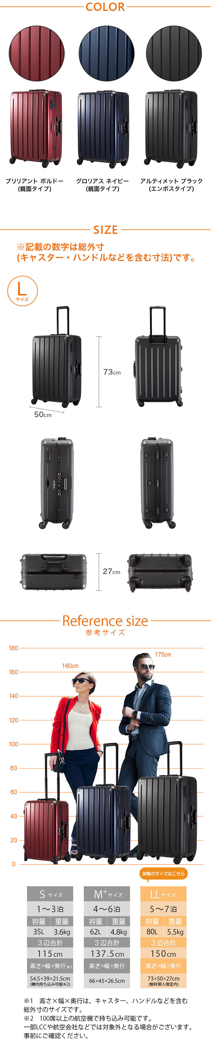 • 無料預け入れ可能サイズ多くの航空会社で定めらている国際線での無料受託手荷物サイズ3辺合計158cm以内に対応。(3辺合計157cm以内)