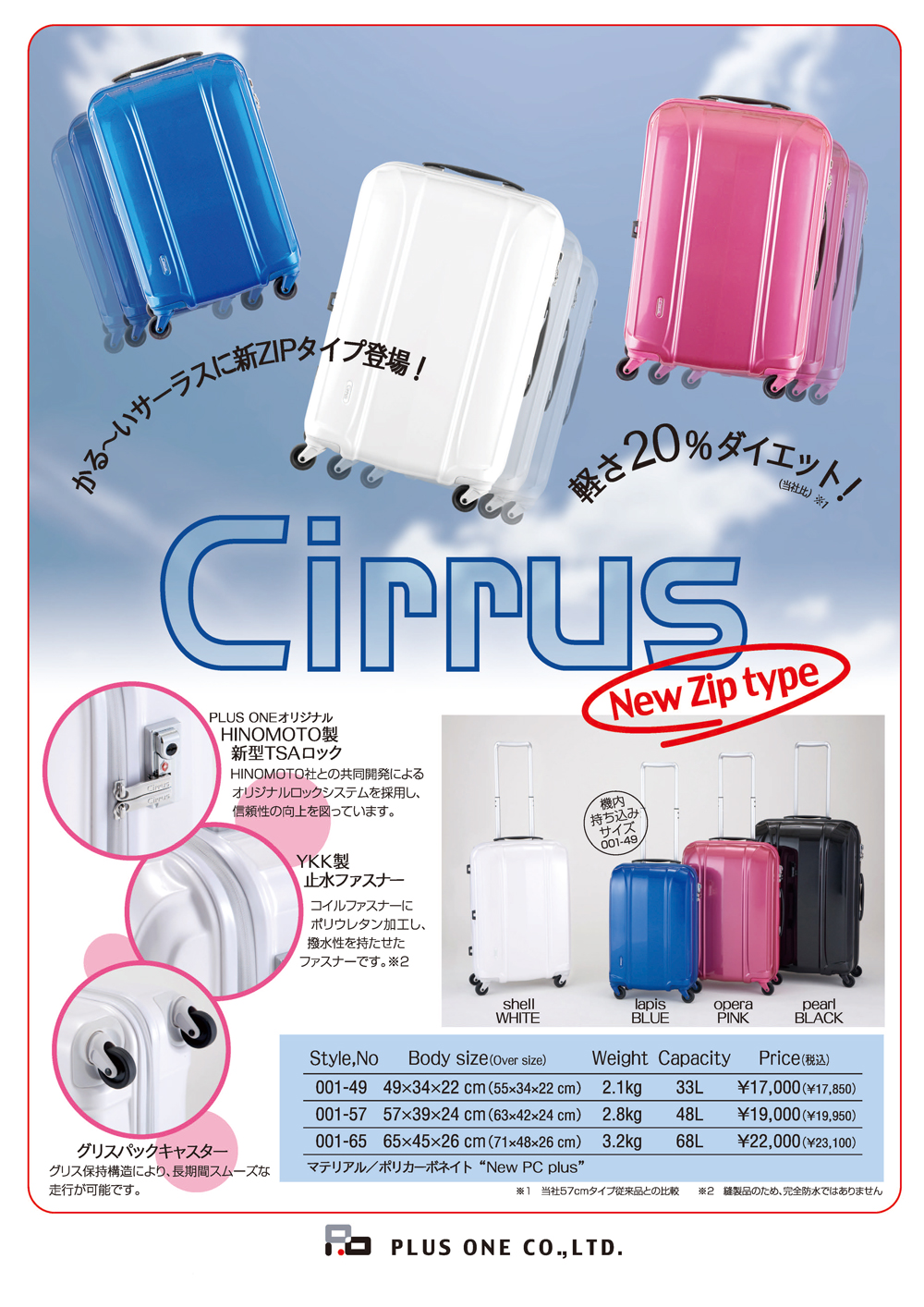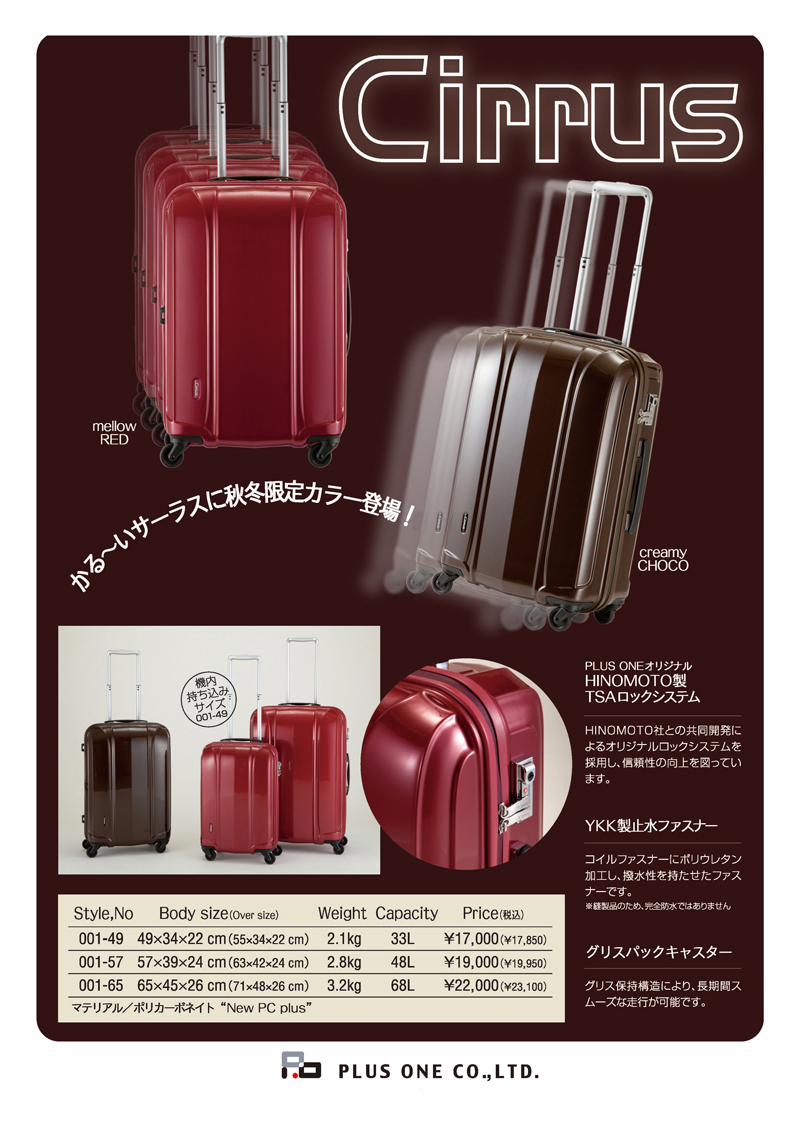 プラスワンの商品の《こだわり》は、『品質』、『フォルム』、『アフターケア』の3点に重点を置いています。『品質』に関しては、各パーツのオリジナル開発、特にアイテムによりスーツケースの鍵となるキャスターを『HINOMOTO』社との共同開発により、信頼性、走行性、耐久性の向上を図っています。また、『2 重検品』を採用し、不良品の徹底排除に努めています。『フォルム』は、弊社デザイナーにより『独自性』、『かっこ良さ』に重点を置き、旅先での素敵な相棒 となります。アフターケアは、弊社スタッフが迅速な対応をし、お客様の快適な旅のサポートをして参ります。プラスワンは信頼と実績、そして《こだわり》を 追求しているブランドです。