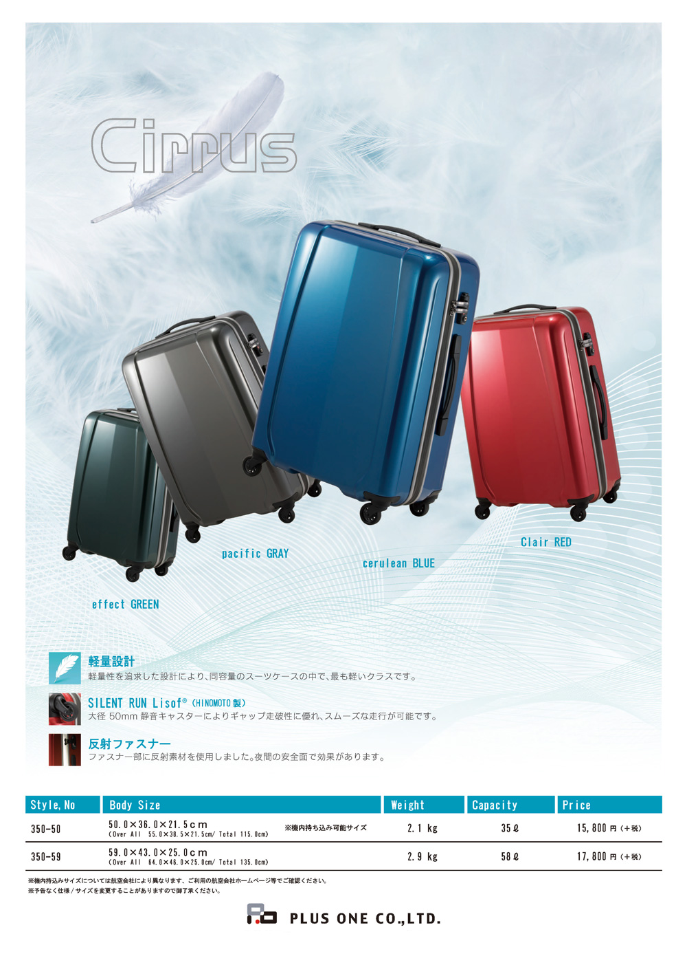 • プラスワン自社開発商品プラスワンの商品の《こだわり》は、『品質』、『フォルム』、『アフターケア』の3点に重きを置いています。『品質』に関しては、アイテムにより各パーツのオリジナル開発、特にスーツケースの鍵となるキャスターを『HINOMOTO』社との共同開発により、信頼性、走行性、耐久性の向上を図っています。