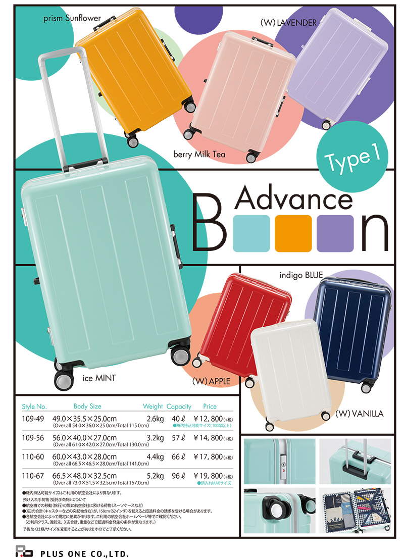 • プラスワン自社開発商品プラスワンの商品の《こだわり》は、『品質』、『フォルム』、『アフターケア』の3点に重きを置いています。『品質』に関しては、アイテムにより各パーツのオリジナル開発、特にスーツケースの鍵となるキャスターを『HINOMOTO』社との共同開発により、信頼性、走行性、耐久性の向上を図っています。
